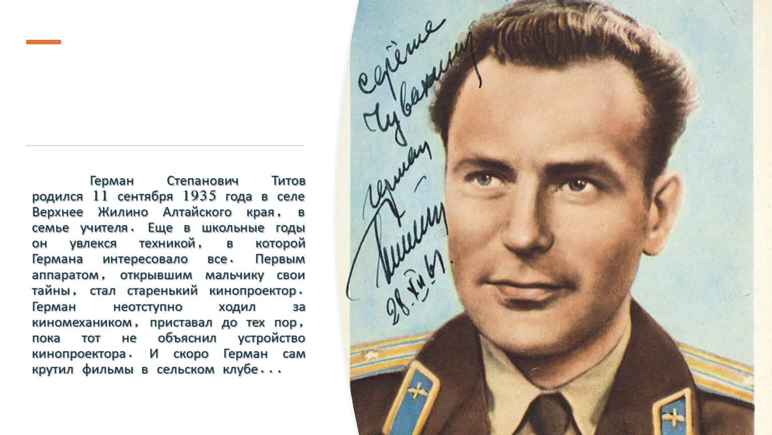 Герман Степанович Титов родился 11 сентября 1935 года в селе Верхнее Жилино Алтайского края, в семье учителя. Еще в школьные годы он увлекся техникой, в которой Германа интересовало все. Первым аппаратом, открывшим мальчику свои тайны, стал старенький кинопроектор. Герман неотступно ходил за киномехаником, приставал до тех пор, пока тот не объяснил устройство кинопроектора. И скоро Герман сам крутил фильмы в сельском клубе...