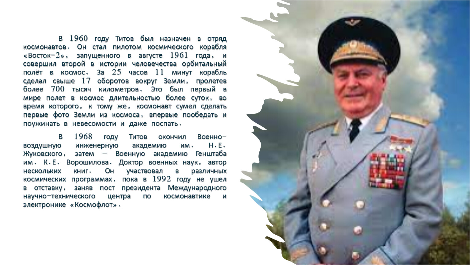 В 1960 году Титов был назначен в отряд космонавтов. Он стал пилотом космического корабля «Восток-2», запущенного в августе 1961 года, и совершил второй в истории человечества орбитальный полёт в космос. За 25 часов 11 минут корабль сделал свыше 17 оборотов вокруг Земли, пролетев более 700 тысяч километров. Это был первый в мире полет в космос длительностью более суток, во время которого, к тому же, космонавт сумел сделать первые фото Земли из космоса, впервые пообедать и поужинать в невесомости и даже поспать.