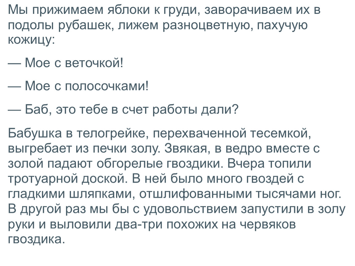 Мы прижимаем яблоки к груди, заворачиваем их в подолы рубашек, лижем разноцветную, пахучую кожицу: