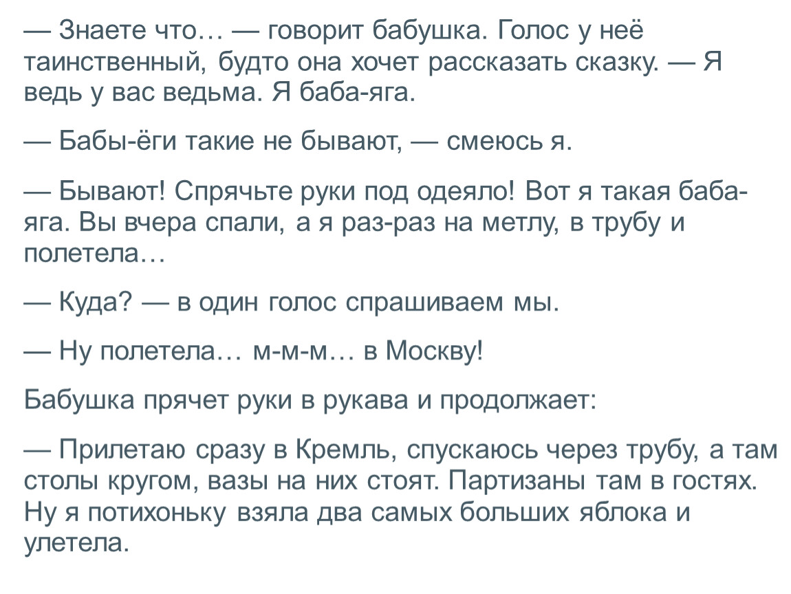 — Знаете что… — говорит бабушка. Голос у неё таинственный, будто она хочет рассказать сказку. — Я ведь у вас ведьма. Я баба-яга.