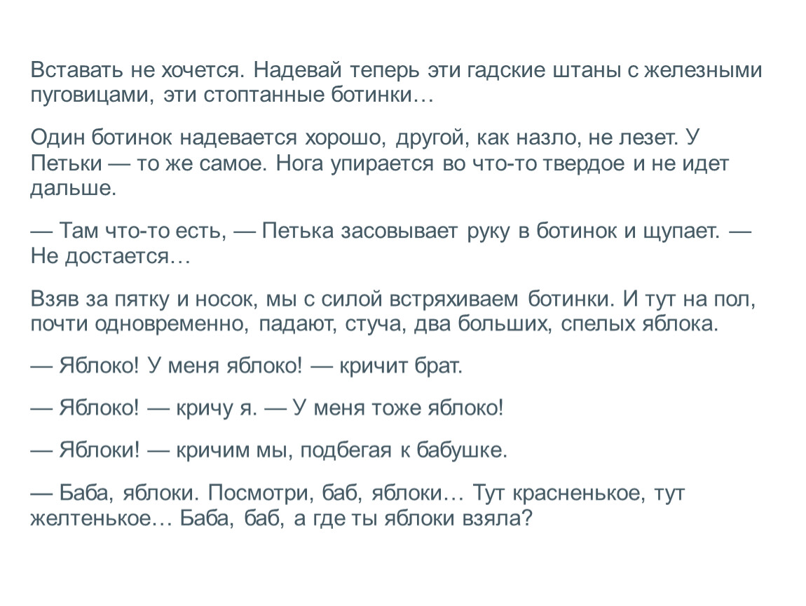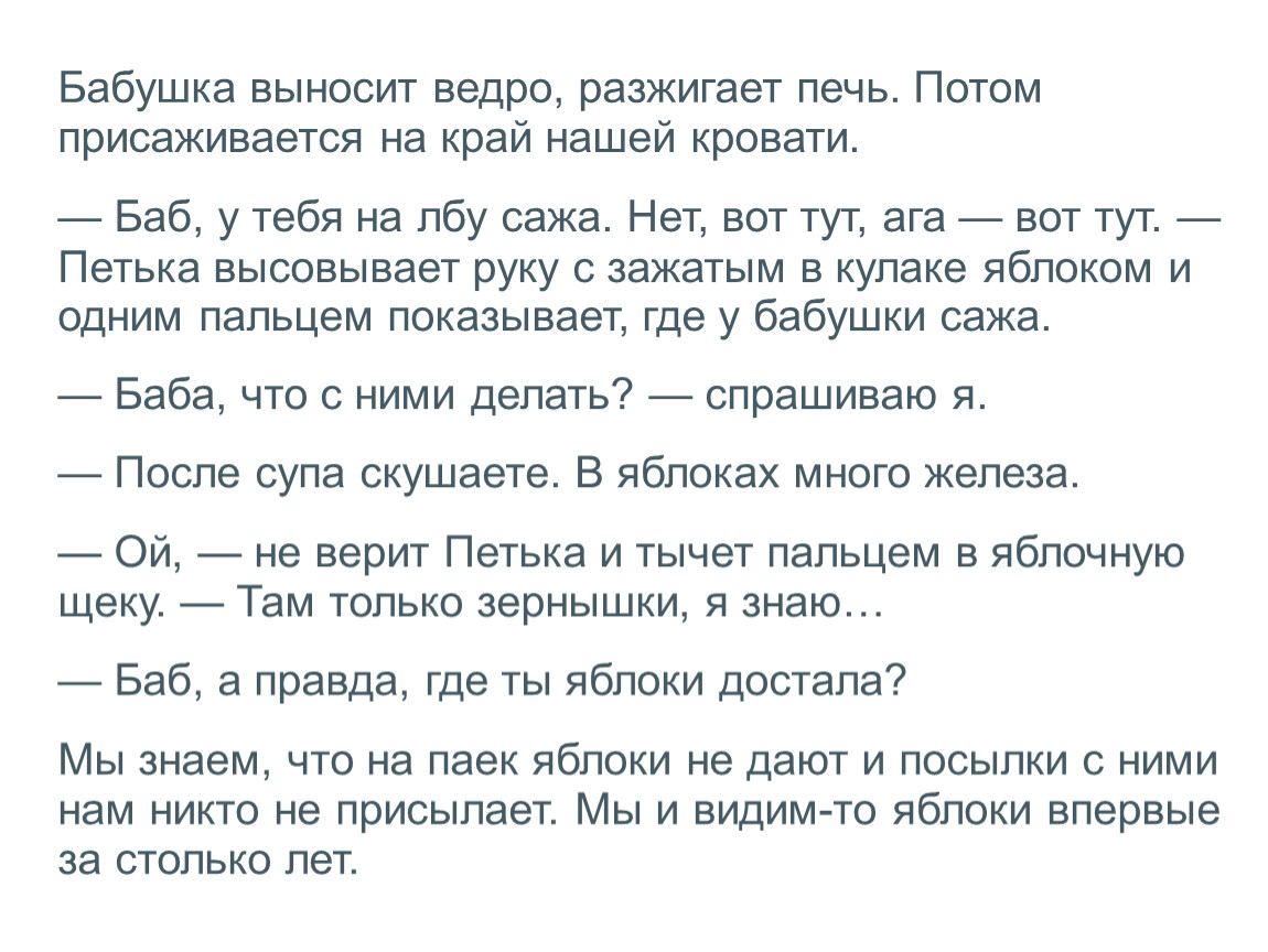 — Баб, у тебя на лбу сажа. Нет, вот тут, ага — вот тут. — Петька высовывает руку с зажатым в кулаке яблоком и одним пальцем показывает, где у бабушки сажа.