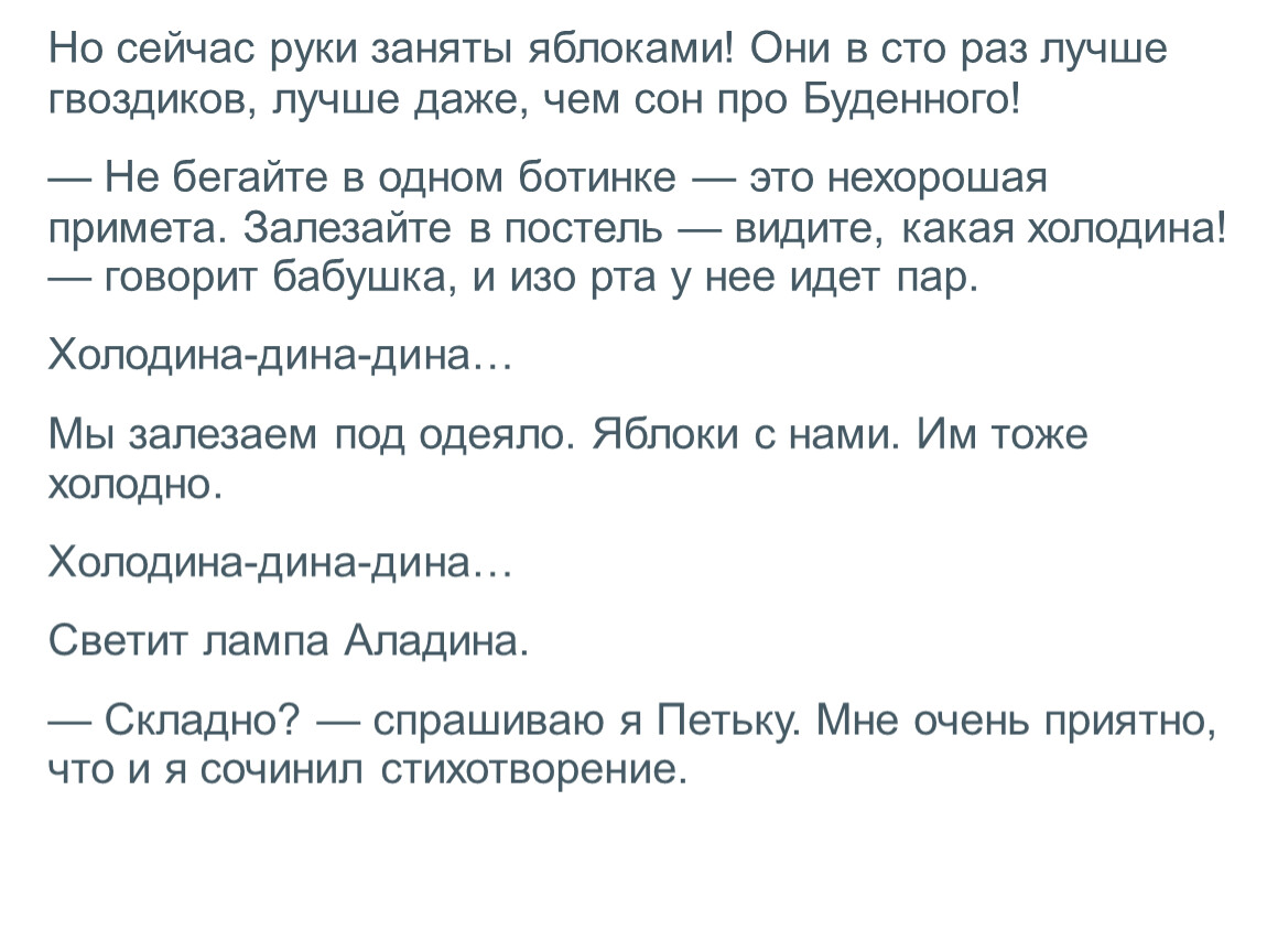 Но сейчас руки заняты яблоками! Они в сто раз лучше гвоздиков, лучше даже, чем сон про Буденного!