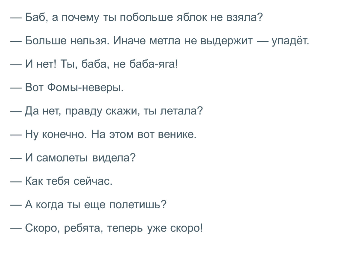 — Бывают! Спрячьте руки под одеяло! Вот я такая баба-яга. Вы вчера спали, а я раз-раз на метлу, в трубу и полетела…