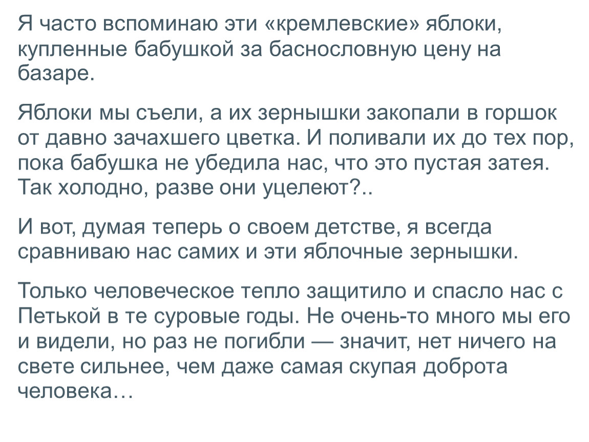 И вот, думая теперь о своем детстве, я всегда сравниваю нас самих и эти яблочные зернышки.