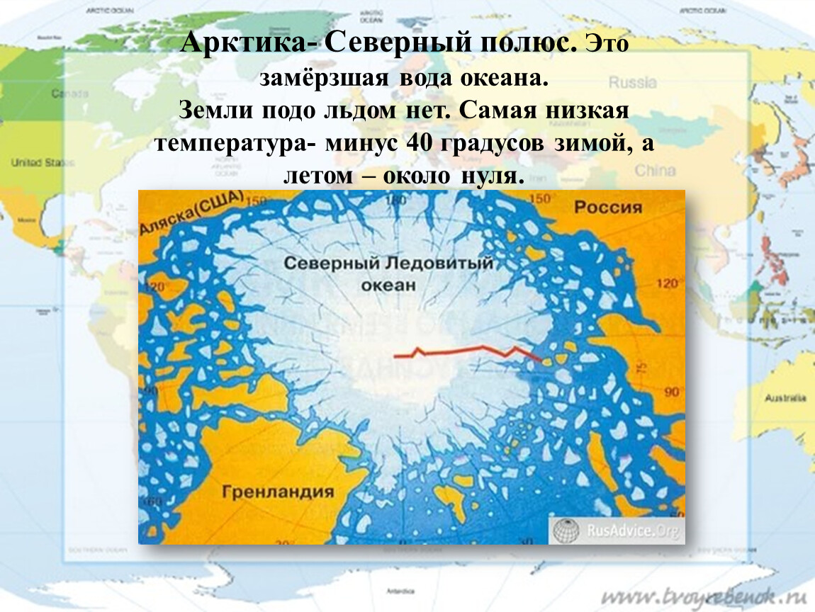 Арктика- Северный полюс. Это замёрзшая вода океана.