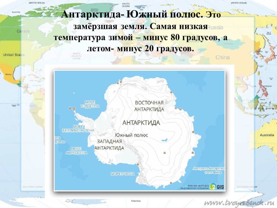 Антарктида- Южный полюс. Это замёрзшая земля. Самая низкая температура зимой – минус 80 градусов, а летом- минус 20 градусов.