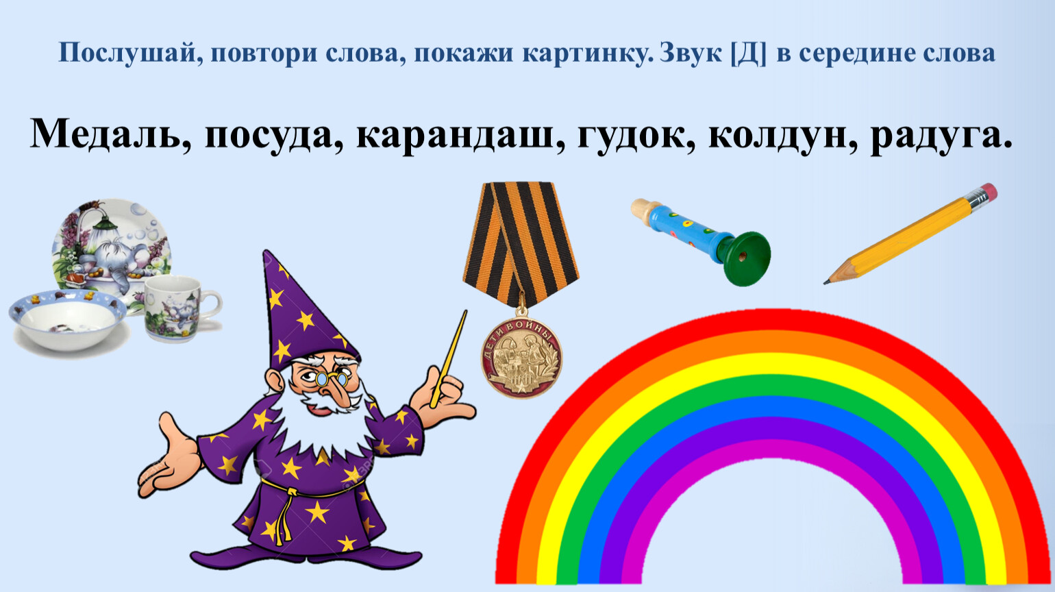 Медаль, посуда, карандаш, гудок, колдун, радуга.