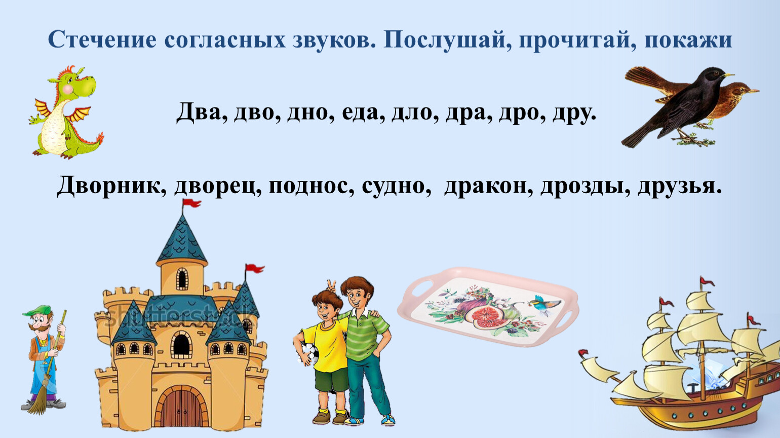 Стечение согласных звуков. Послушай, прочитай, покажи