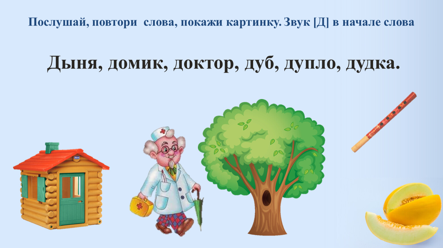Дыня, домик, доктор, дуб, дупло, дудка.