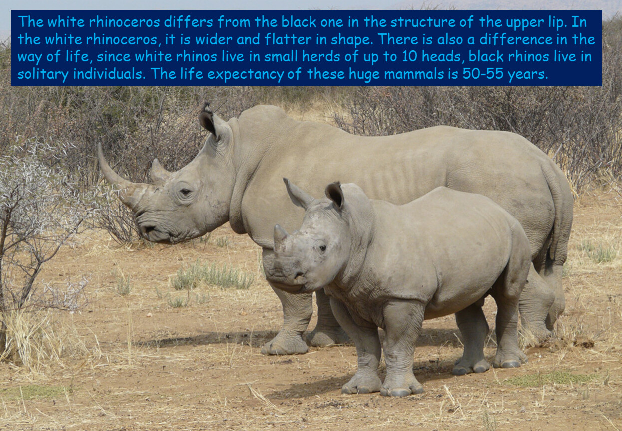 The white rhinoceros differs from the black one in the structure of the upper lip. In the white rhinoceros, it is wider and flatter in shape. There is also a difference in the way of life, since white rhinos live in small herds of up to 10 heads, black rhinos live in solitary individuals. The life expectancy of these huge mammals is 50-55 years.