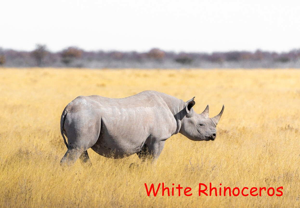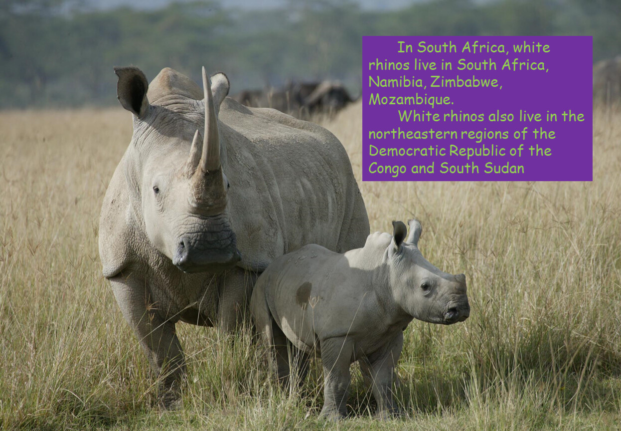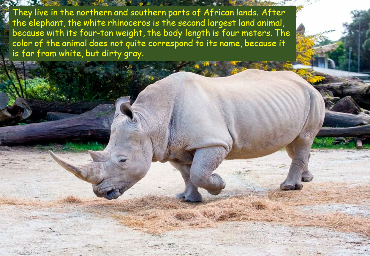They live in the northern and southern parts of African lands. After the elephant, the white rhinoceros is the second largest land animal, because with its four-ton weight, the body length is four meters. The color of the animal does not quite correspond to its name, because it is far from white, but dirty gray.