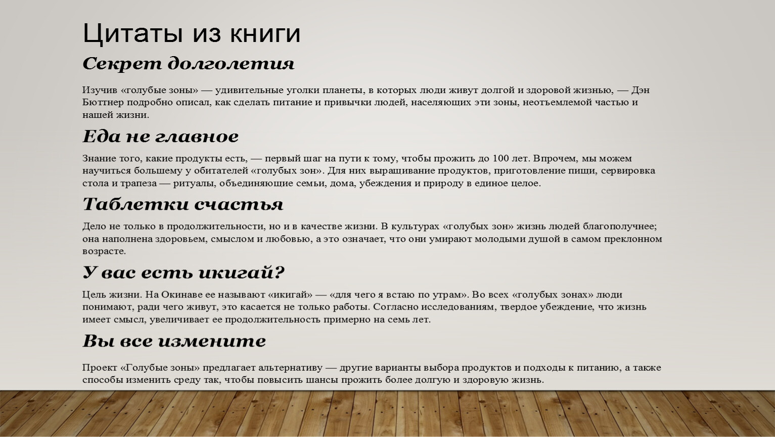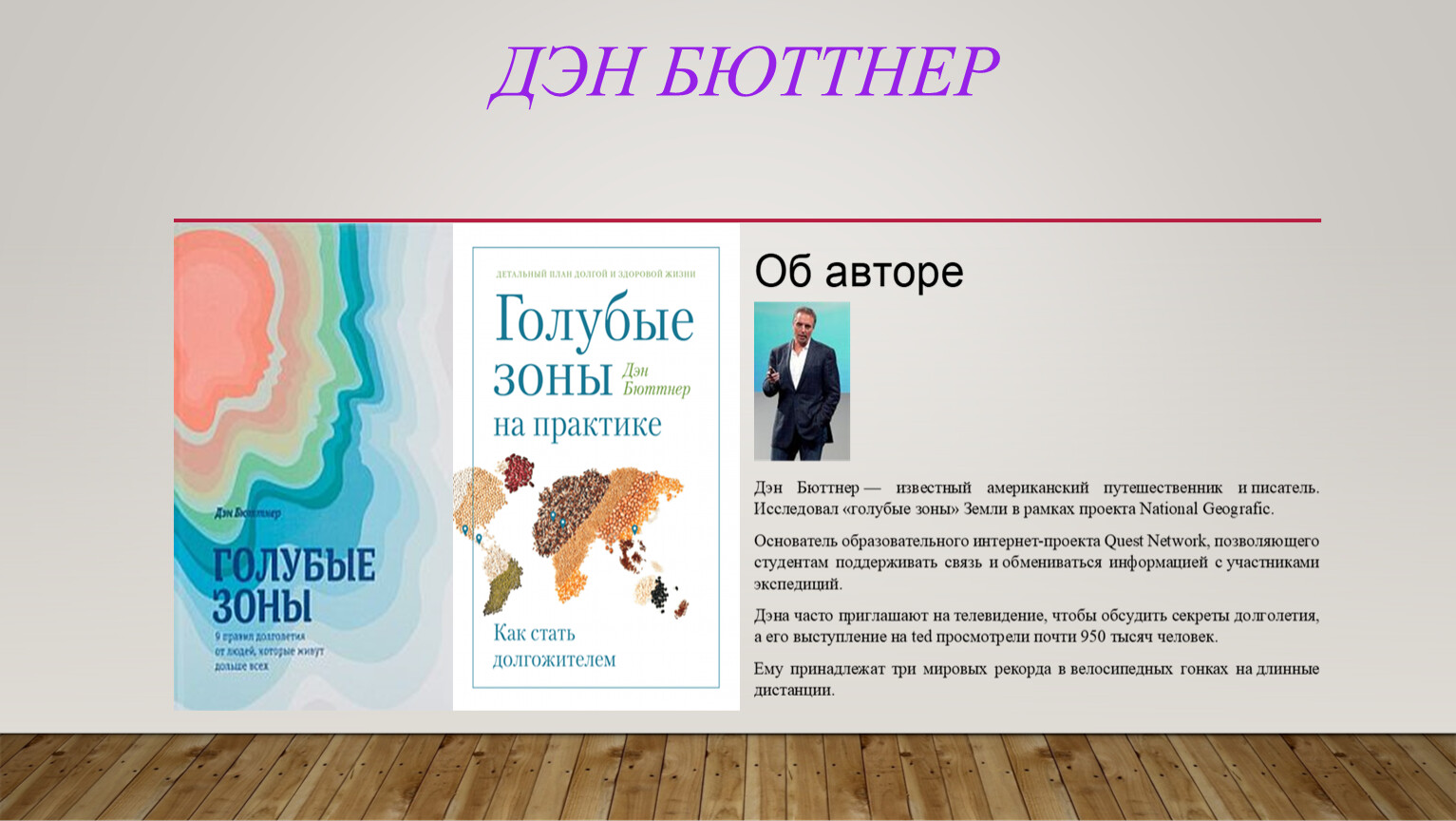 • «Голубые зоны» Д. Бюттнера: прошлое, образ жизни и традиции долгожителей, людей, которые сохраняют физическую форму и ясность ума далеко за 100 лет;