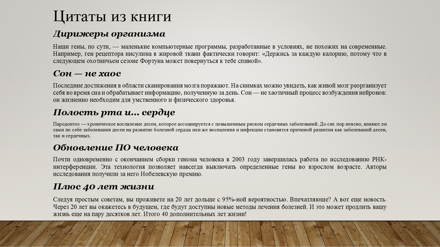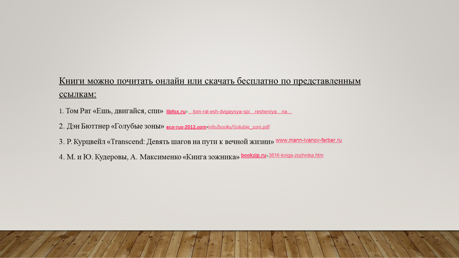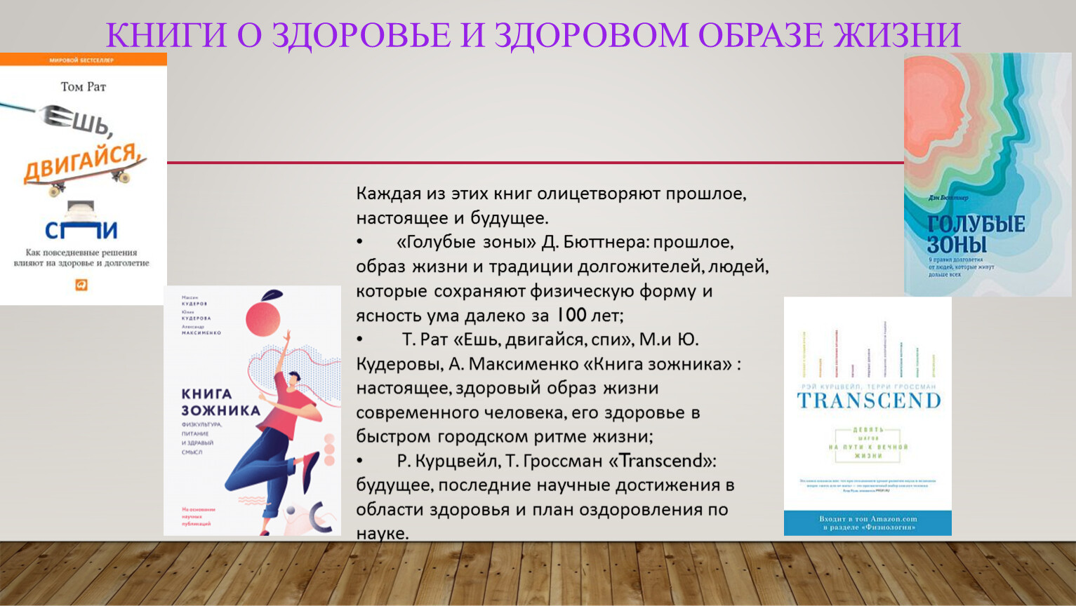 • Т. Рат «Ешь, двигайся, спи», М.и Ю. Кудеровы, А. Максименко «Книга зожника» : настоящее, здоровый образ жизни современного человека, его здоровье в быстром городском ритме жизни;