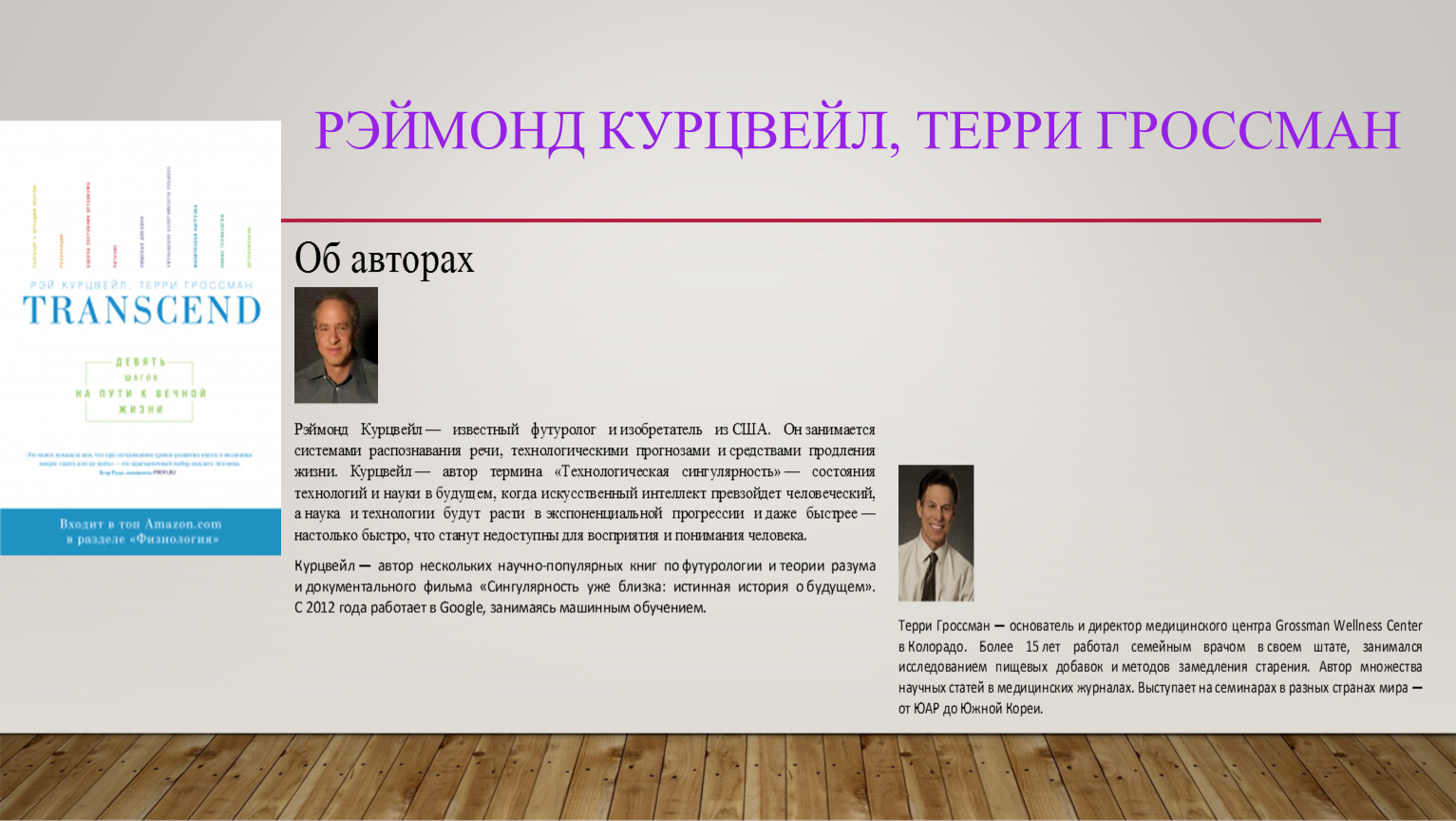 • Р. Курцвейл, Т. Гроссман «Transcend»: будущее, последние научные достижения в области здоровья и план оздоровления по науке.
