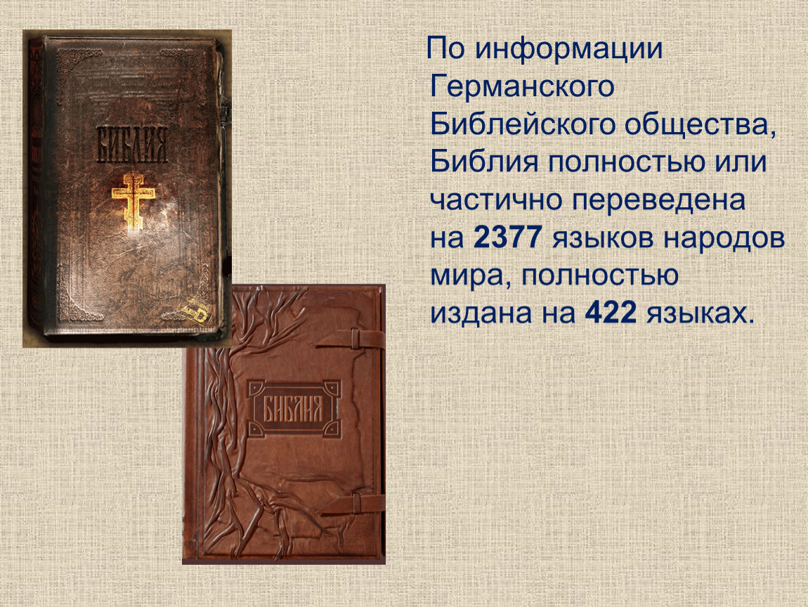 По информации Германского Библейского общества, Библия полностью или частично переведена на 2377 языков народов мира, полностью издана на 422 языках.