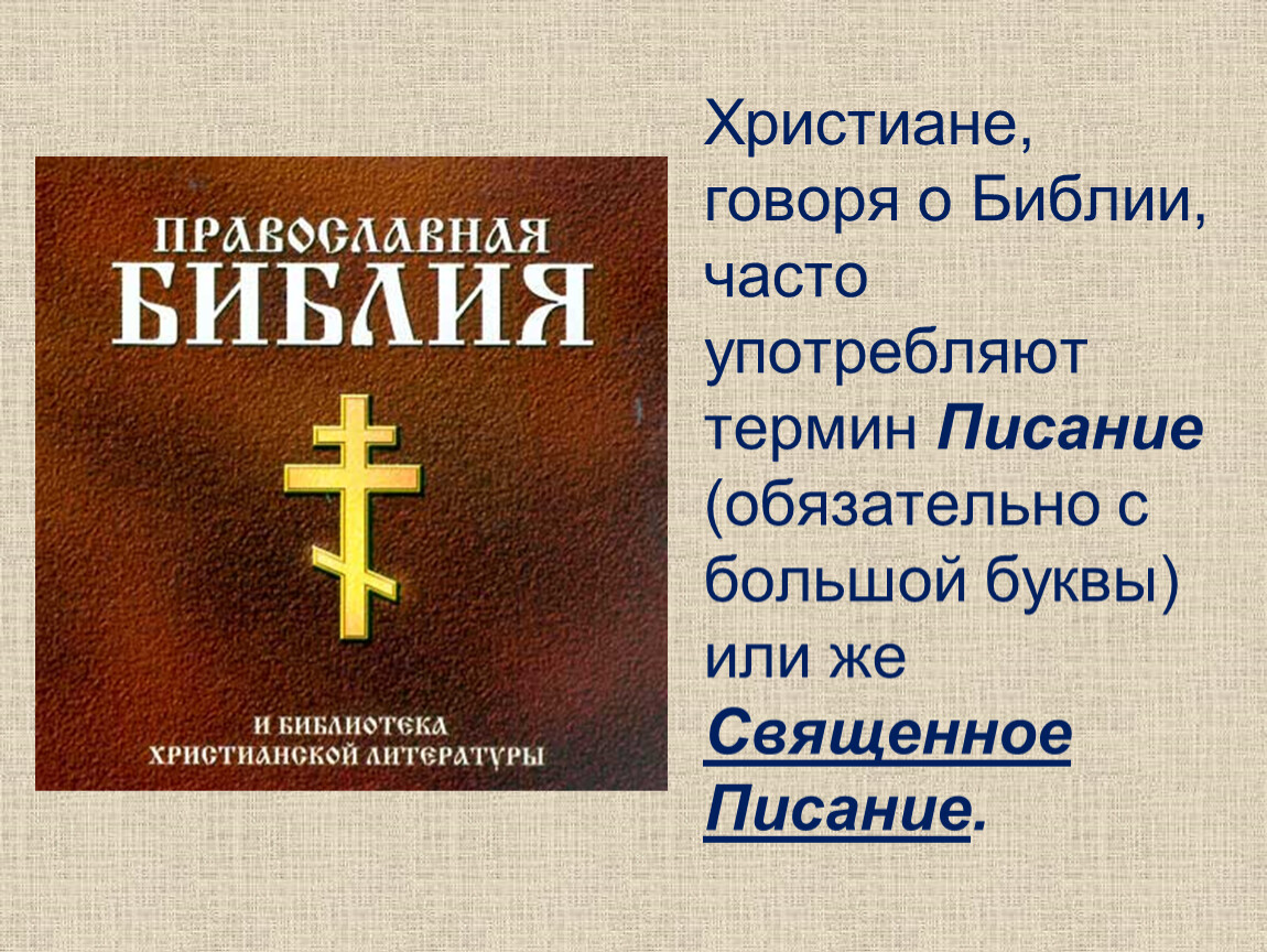 Христиане, говоря о Библии, часто употребляют термин Писание (обязательно с большой буквы) или же Священное Писание.