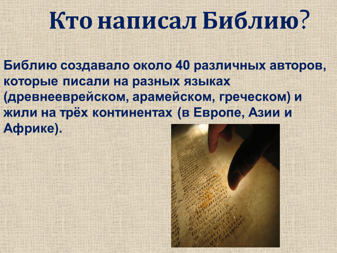 Библию создавало около 40 различных авторов, которые писали на разных языках (древнееврейском, арамейском, греческом) и жили на трёх континентах (в Европе, Азии и Африке).