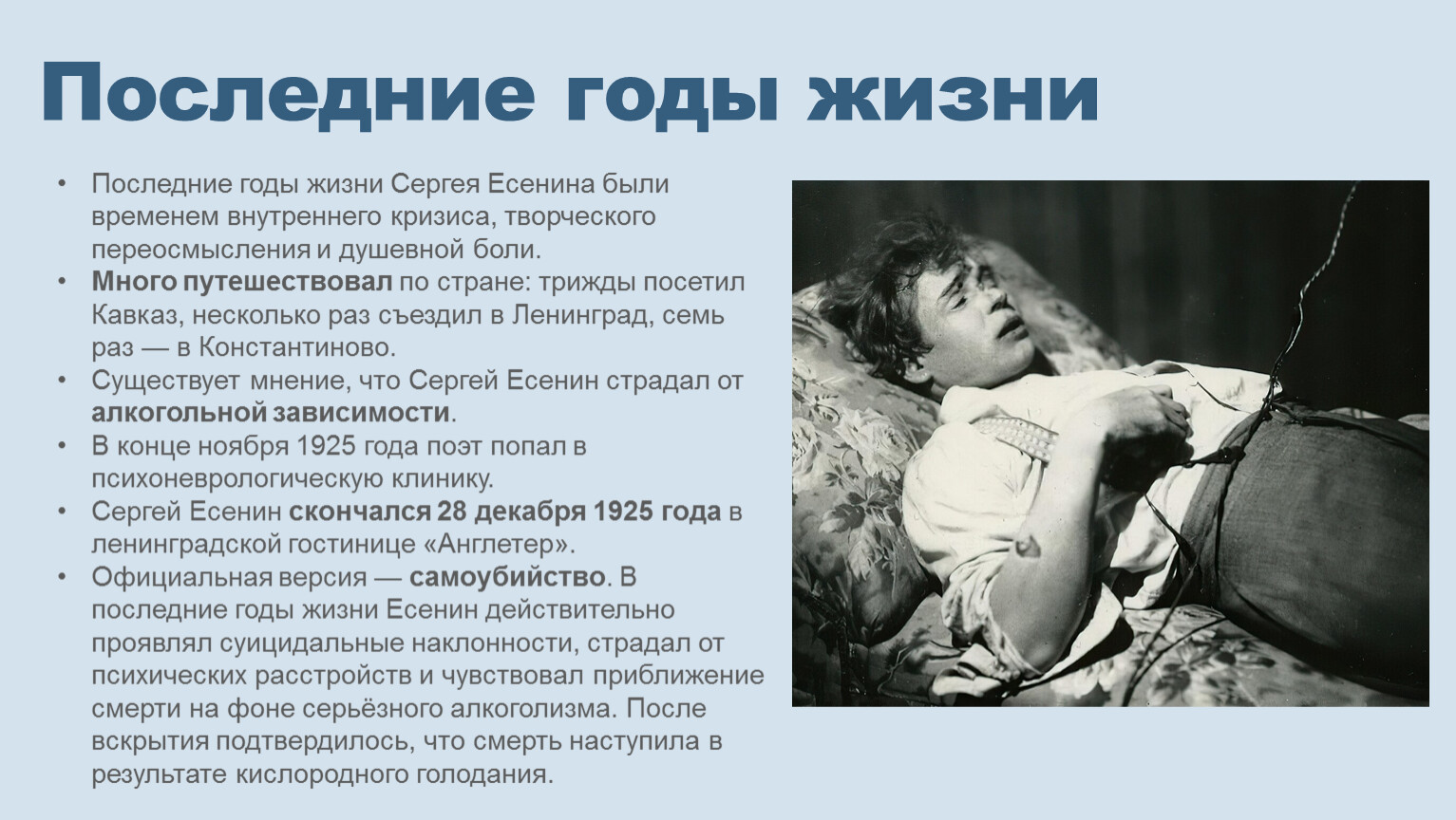 Последние годы жизни Сергея Есенина были временем внутреннего кризиса, творческого переосмысления и душевной боли.