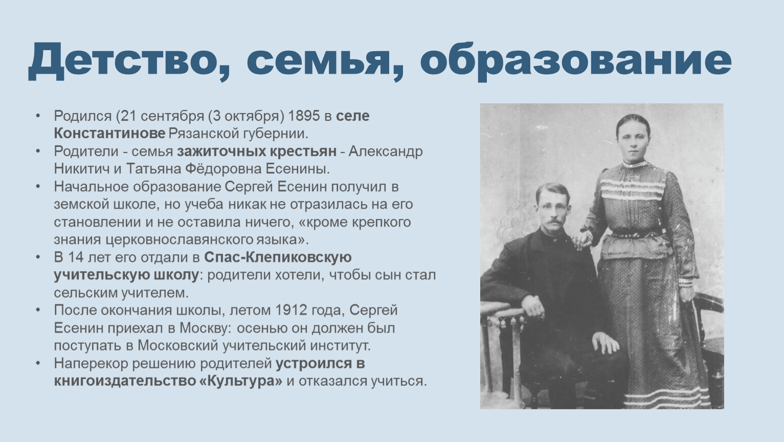 Родители - семья зажиточных крестьян - Александр Никитич и Татьяна Фёдоровна Есенины.