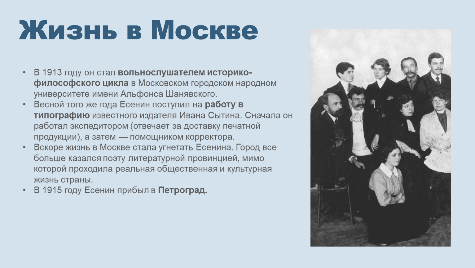 Весной того же года Есенин поступил на работу в типографию известного издателя Ивана Сытина. Сначала он работал экспедитором (отвечает за доставку печатной продукции), а затем — помощником корректора.