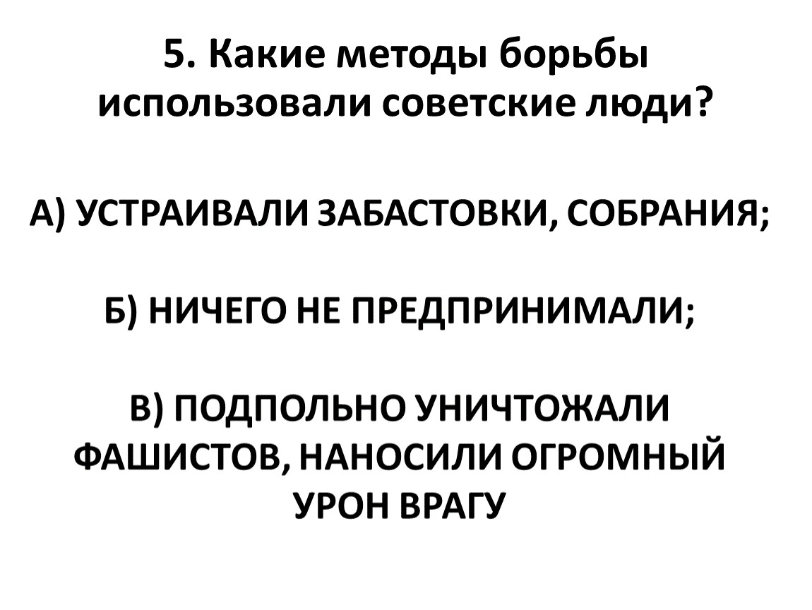А) устраивали забастовки, собрания;б) ничего не предпринимали;в) подпольно уничтожали фашистов, наносили огромный урон врагу