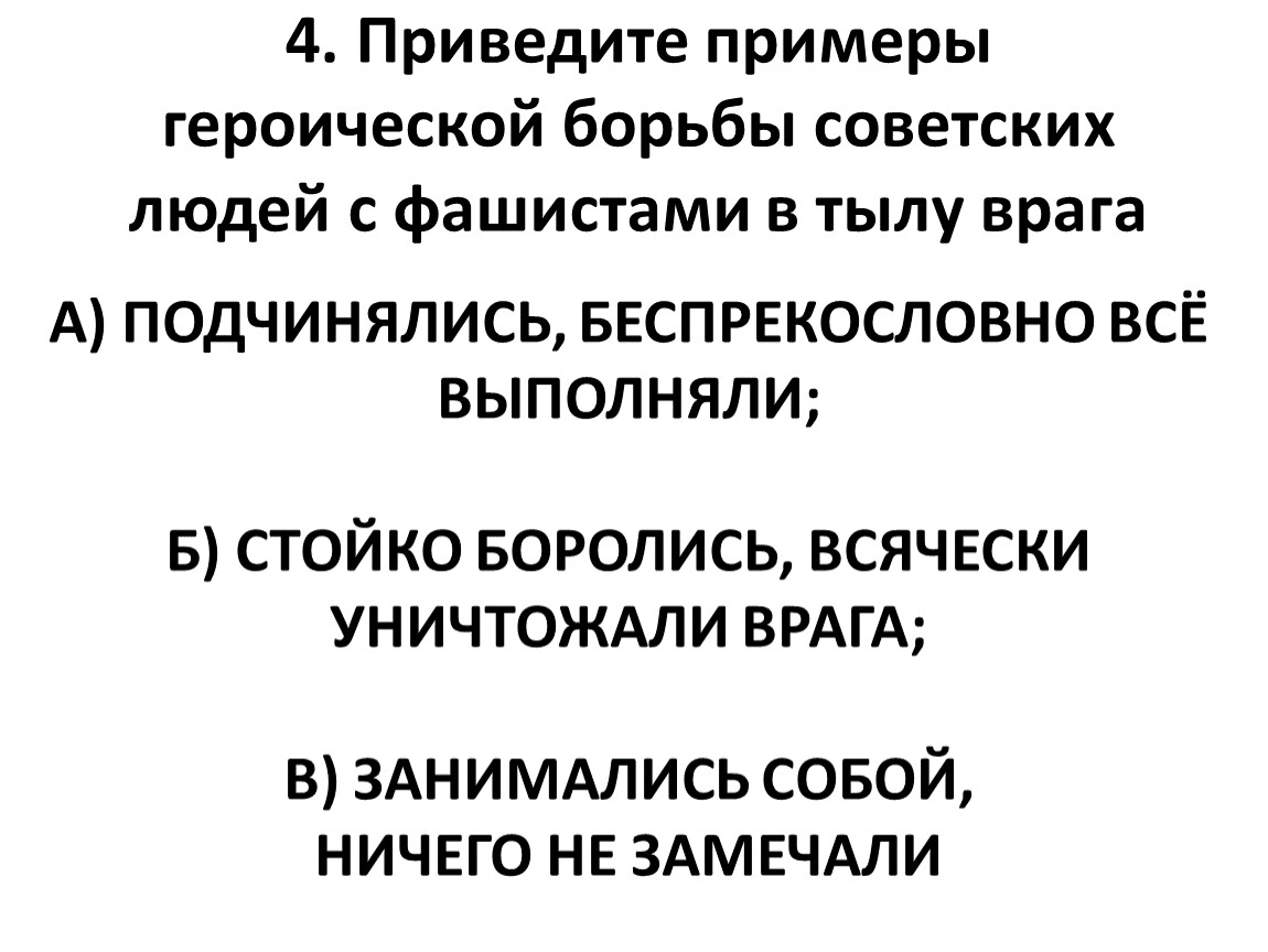 4. Приведите примеры героической борьбы советских людей с фашистами в тылу врага