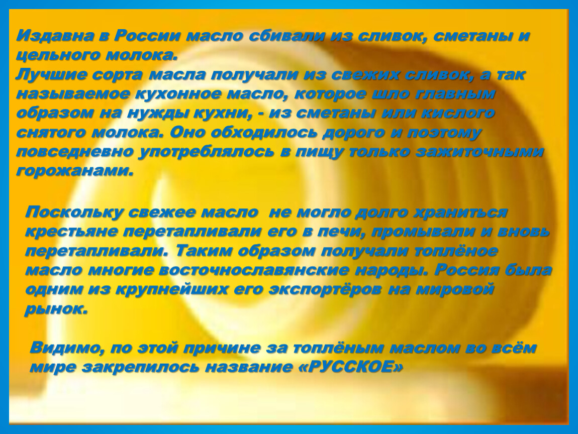 Видимо, по этой причине за топлёным маслом во всём мире закрепилось название «РУССКОЕ»