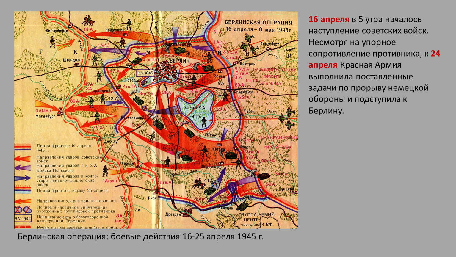 16 апреля в 5 утра началось наступление советских войск. Несмотря на упорное сопротивление противника, к 24 апреля Красная Армия выполнила поставленные задачи по прорыву немецкой обороны и подступила к Берлину.
