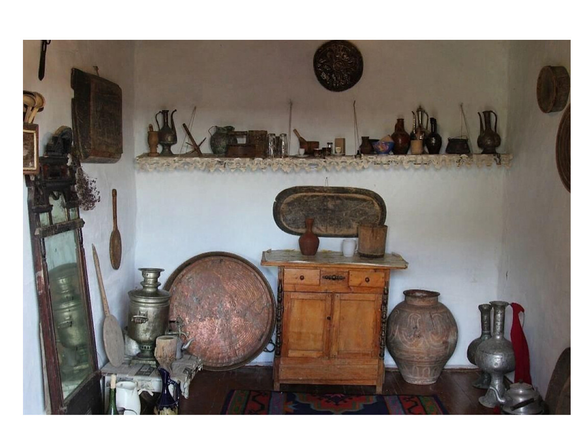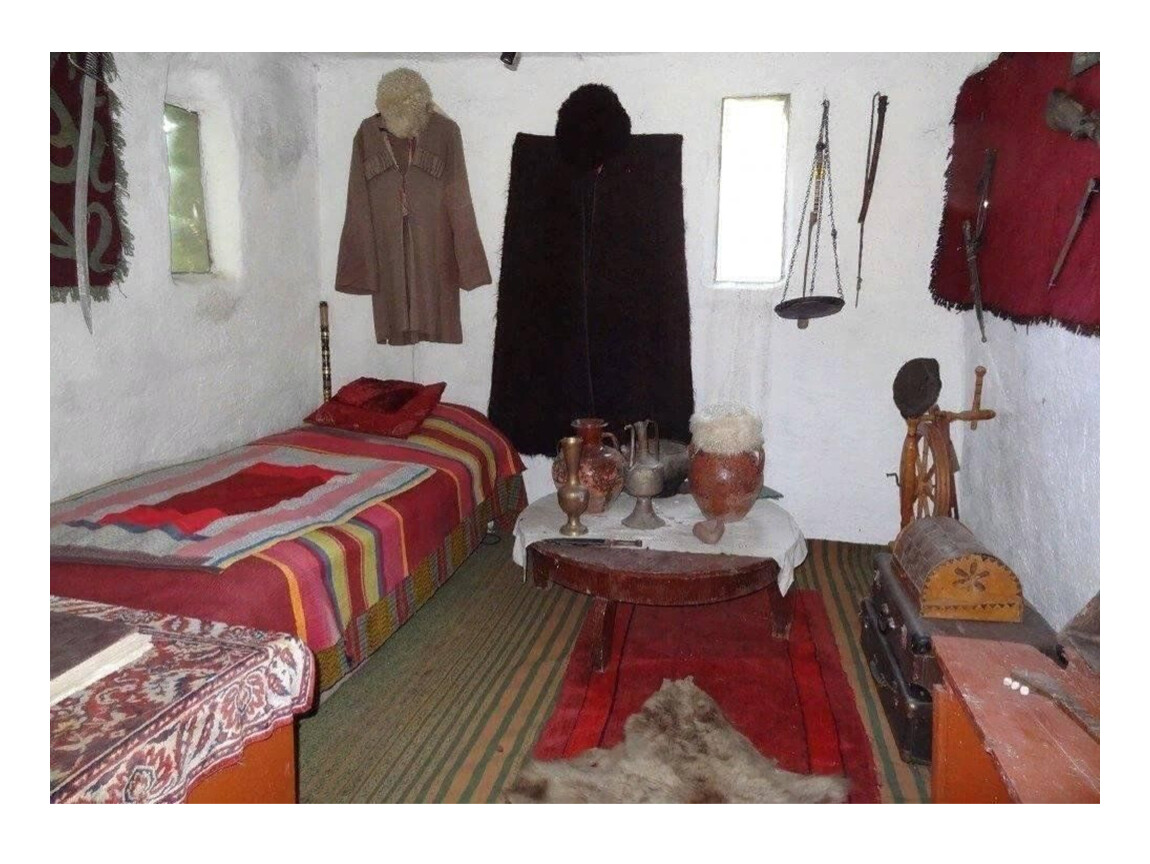 Мебели было мало: кресло для хозяина, столик для еды, низкие скамейки. Спали, в основном, на полу, используя матрацы, войлоки, ковры, паласы, одеяла — их хранили на широких полках вдоль стен комнат, там же стояли сундуки и посуда. Войлочных изделий стелили на пол, ими накрывались, украшали стены, утепляли комнаты. Чеченские ковры обычно имеют многоцветный орнамент и бахрому синего и красного цвета. Окон в саклях не было — от самого пола прорубалось четырехугольное отверстие, которое на ночь закрывалось изнутри ставней.