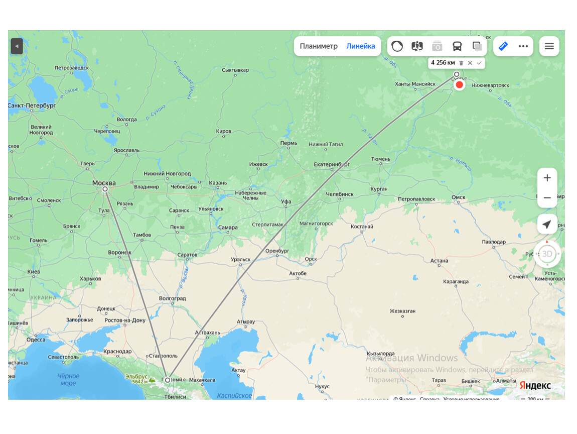 Карта России с точкой Грозный и Сургут