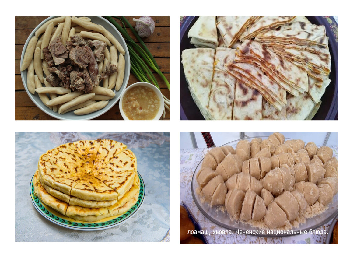 Национальная кухня чеченцев включает традиционные блюда разных категорий: супы, лепёшки, мясные блюда и десерты. Основу кухни составляют мясо, черемша, сыр, тыква, творог, кукуруза. Основные компоненты — острые приправы, лук, чеснок, перец, чабрец.