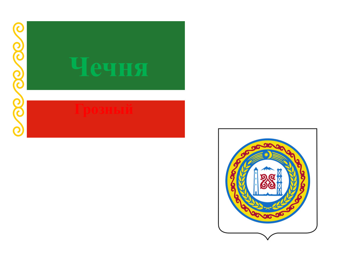 Флаг Чеченской республики состоит из трёх горизонтальных полос: зелёной, белой и красной, с вертикальной белой полосой у древка, украшенной чеченским орнаментом и золотой бахромой по контуру.