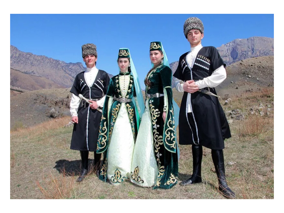 Чеченский женский национальный костюм включал накидку, нижнее платье, пояс и платок.