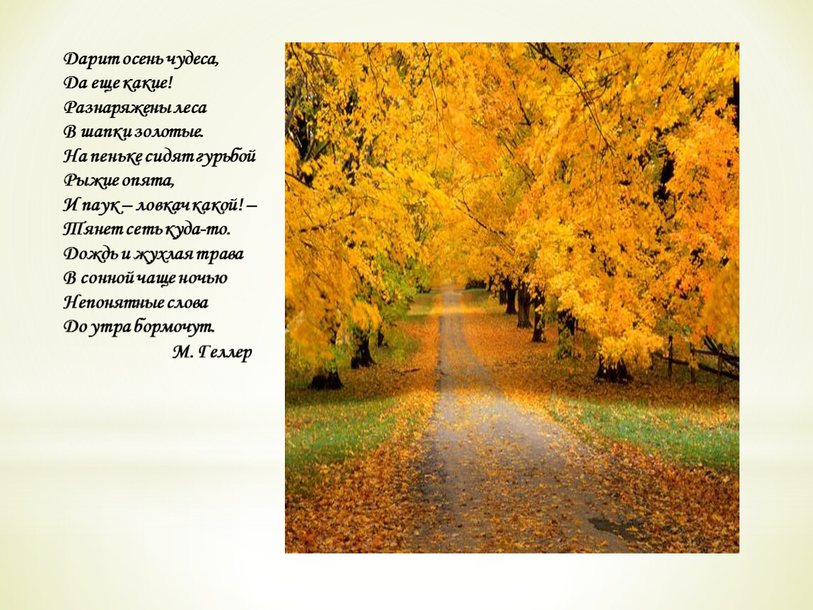 Дарит осень чудеса,Да еще какие!Разнаряжены лесаВ шапки золотые.На пеньке сидят гурьбойРыжие опята,И паук – ловкач какой! –Тянет сеть куда-то.Дождь и жухлая траваВ сонной чаще ночьюНепонятные словаДо утра бормочут.