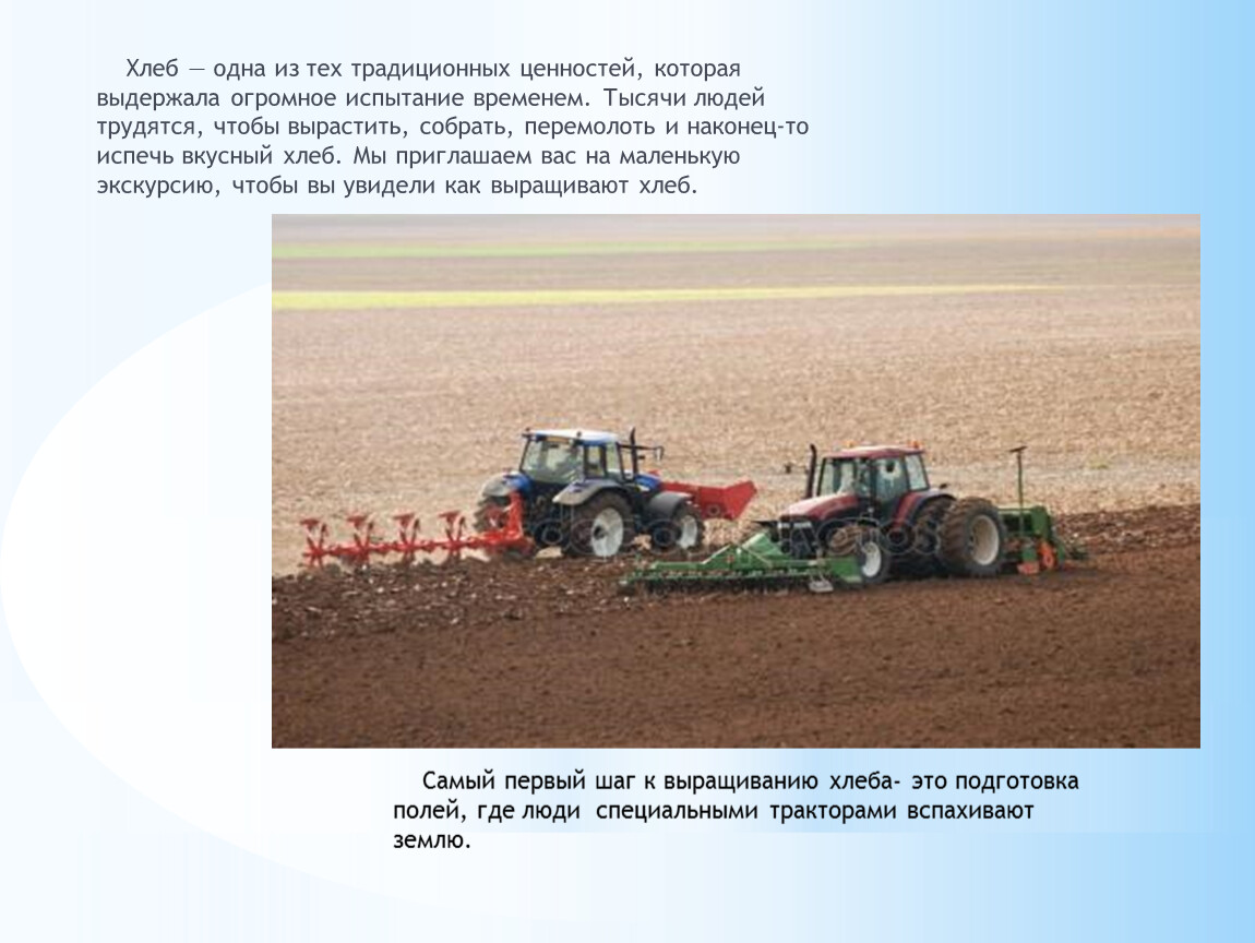 Самый первый шаг к выращиванию хлеба- это подготовка полей, где люди специальными тракторами вспахивают землю.