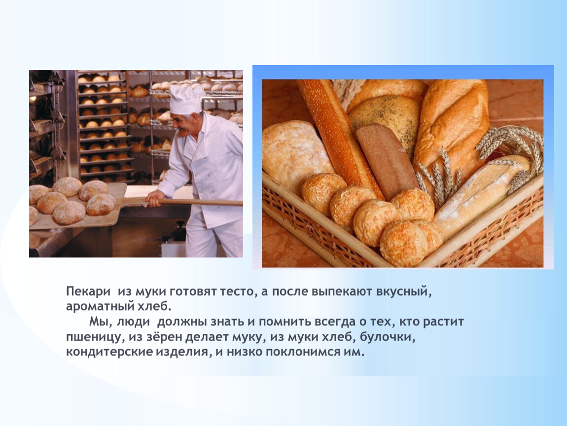 Пекари из муки готовят тесто, а после выпекают вкусный, ароматный хлеб. Мы, люди должны знать и помнить всегда о тех, кто растит пшеницу, из зёрен делает муку, из муки хлеб, булочки, кондитерские изделия, и низко поклонимся им.