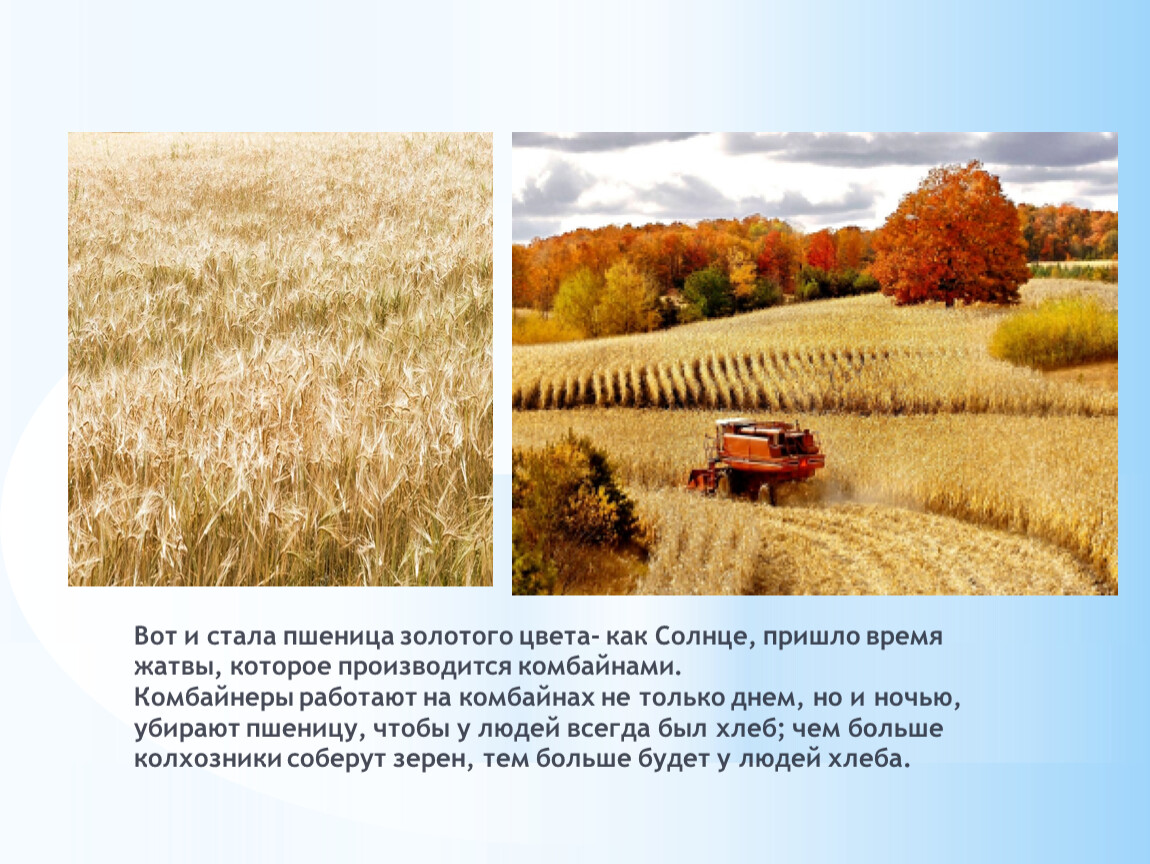 Вот и стала пшеница золотого цвета- как Солнце, пришло время жатвы, которое производится комбайнами.Комбайнеры работают на комбайнах не только днем, но и ночью, убирают пшеницу, чтобы у людей всегда был хлеб; чем больше колхозники соберут зерен, тем больше будет у людей хлеба.