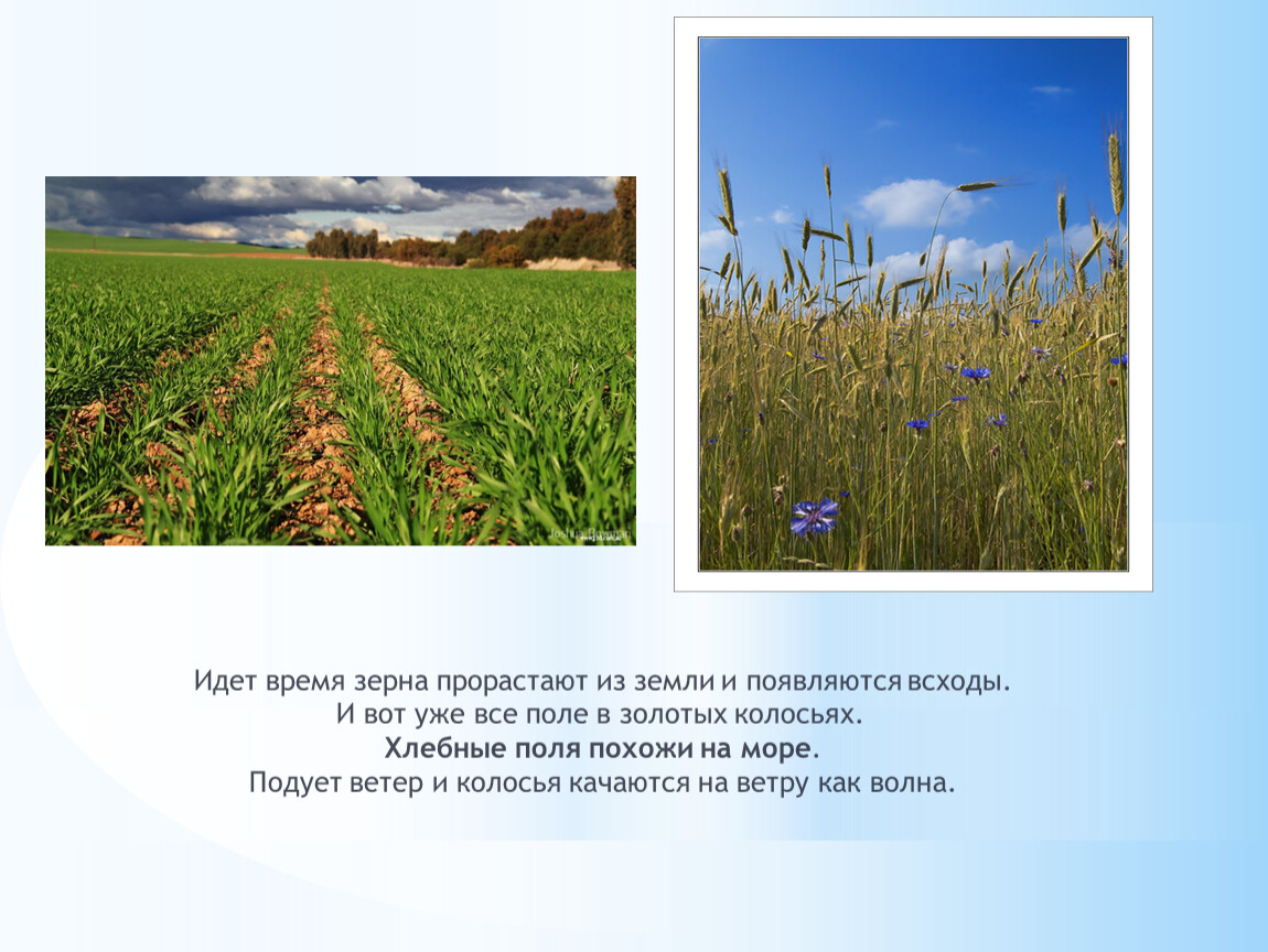 Идет время зерна прорастают из земли и появляются всходы. И вот уже все поле в золотых колосьях. Хлебные поля похожи на море. Подует ветер и колосья качаются на ветру как волна.