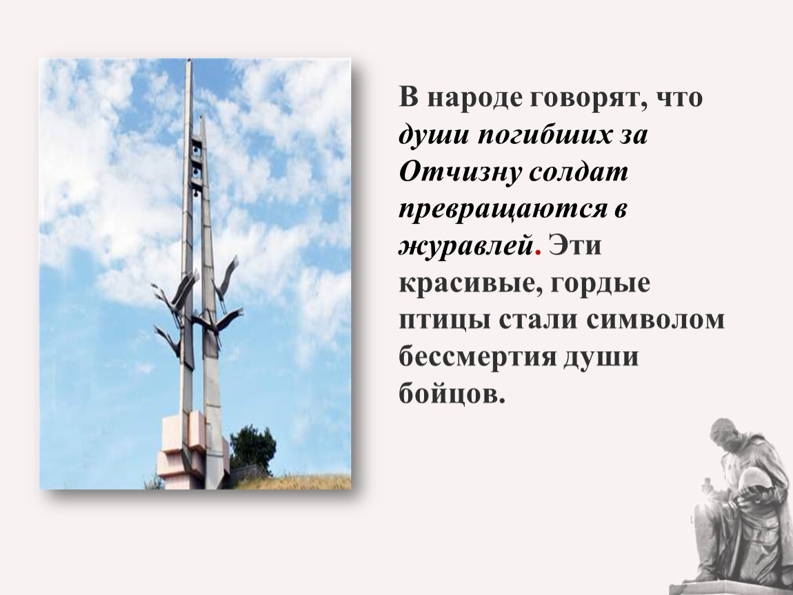 В народе говорят, что души погибших за Отчизну солдат превращаются в журавлей. Эти красивые, гордые птицы стали символом бессмертия души бойцов.
