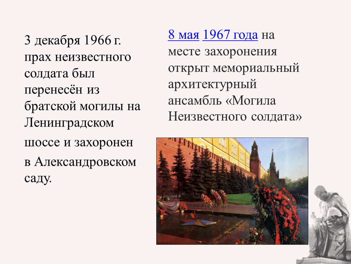 3 декабря 1966 г. прах неизвестного солдата был перенесён из братской могилы на Ленинградском