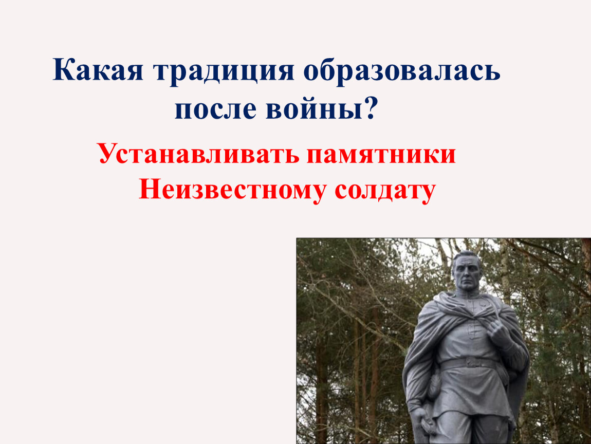 В ходе войн, множество солдат гибло и их останки не могли быть опознаны.В XX веке, после окончания кровопролитной Первой мировой войны стала образовываться традиция, устанавливать памятники Неизвестному солдату, символизирующие память, благодарность и уважение всем погибшим солдатам.