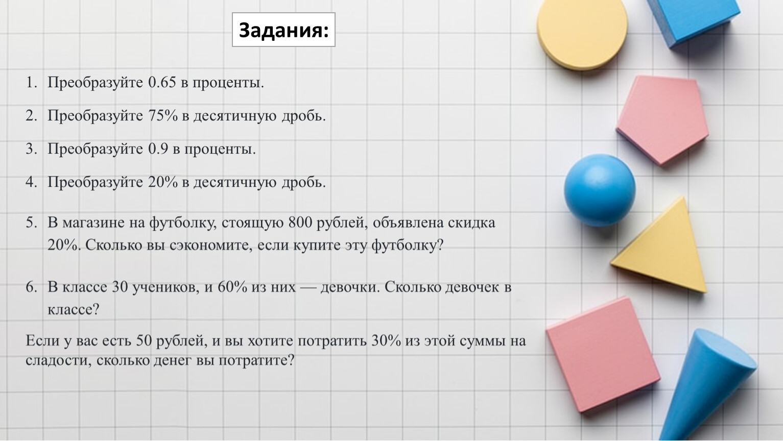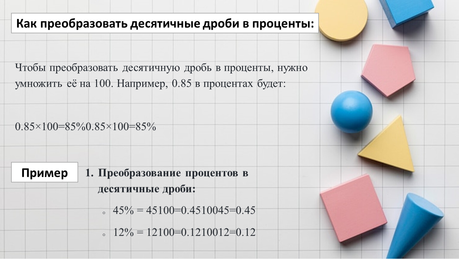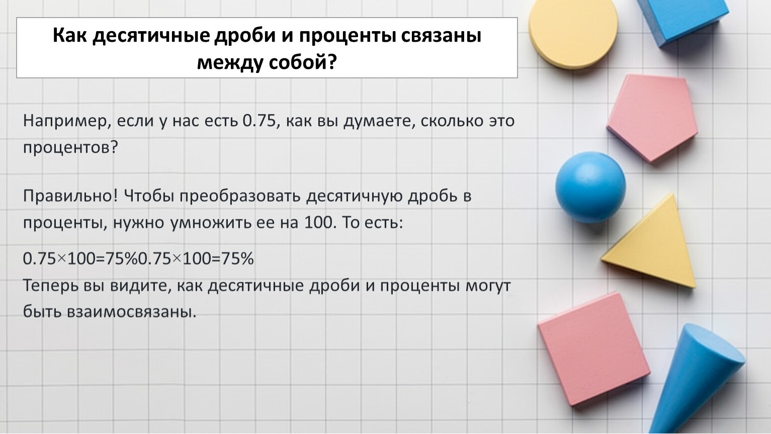 Научить учащихся выполнять преобразования между десятичными дробями и процентами.