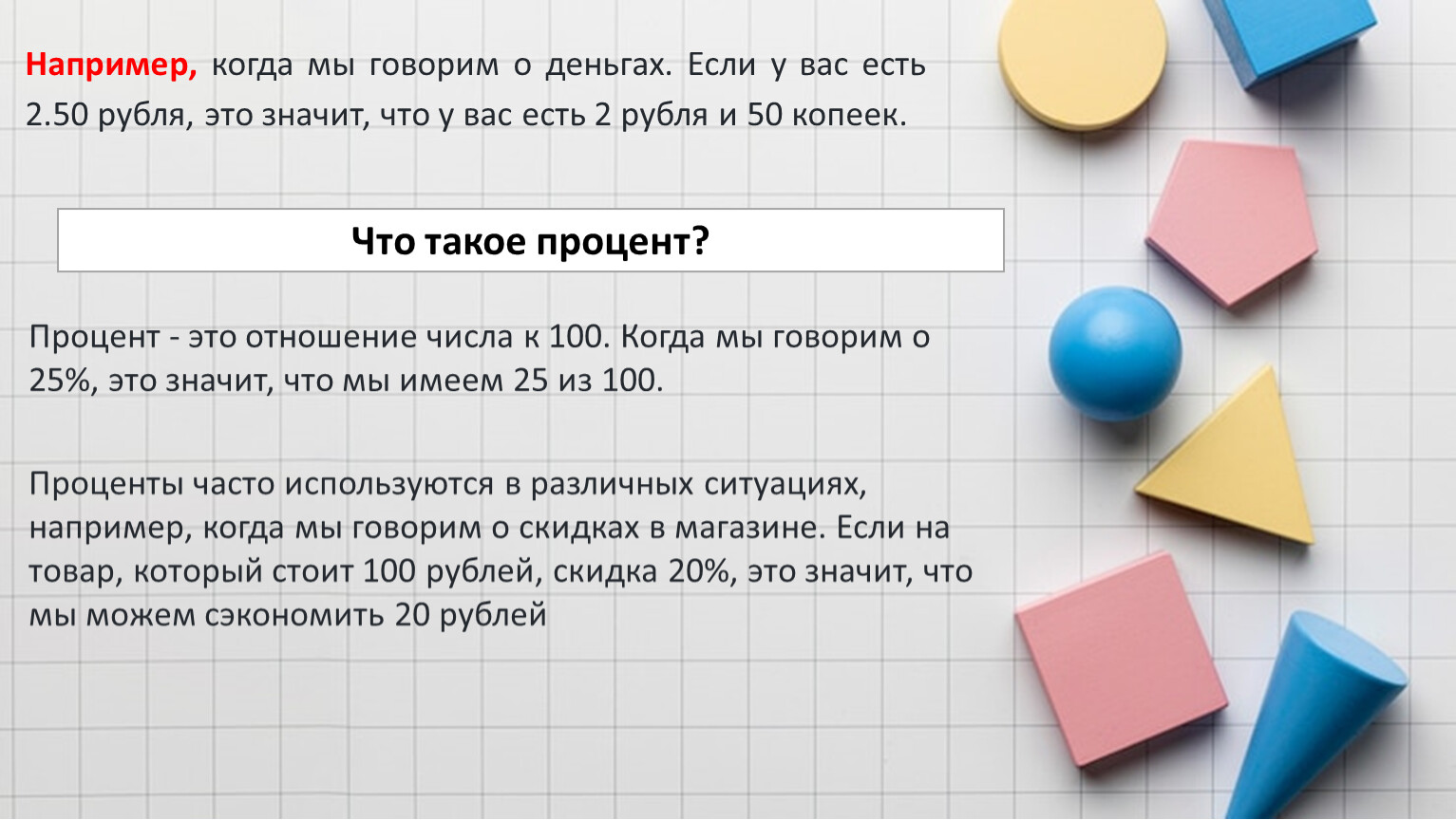 Проценты часто используются в различных ситуациях, например, когда мы говорим о скидках в магазине. Если на товар, который стоит 100 рублей, скидка 20%, это значит, что мы можем сэкономить 20 рублей