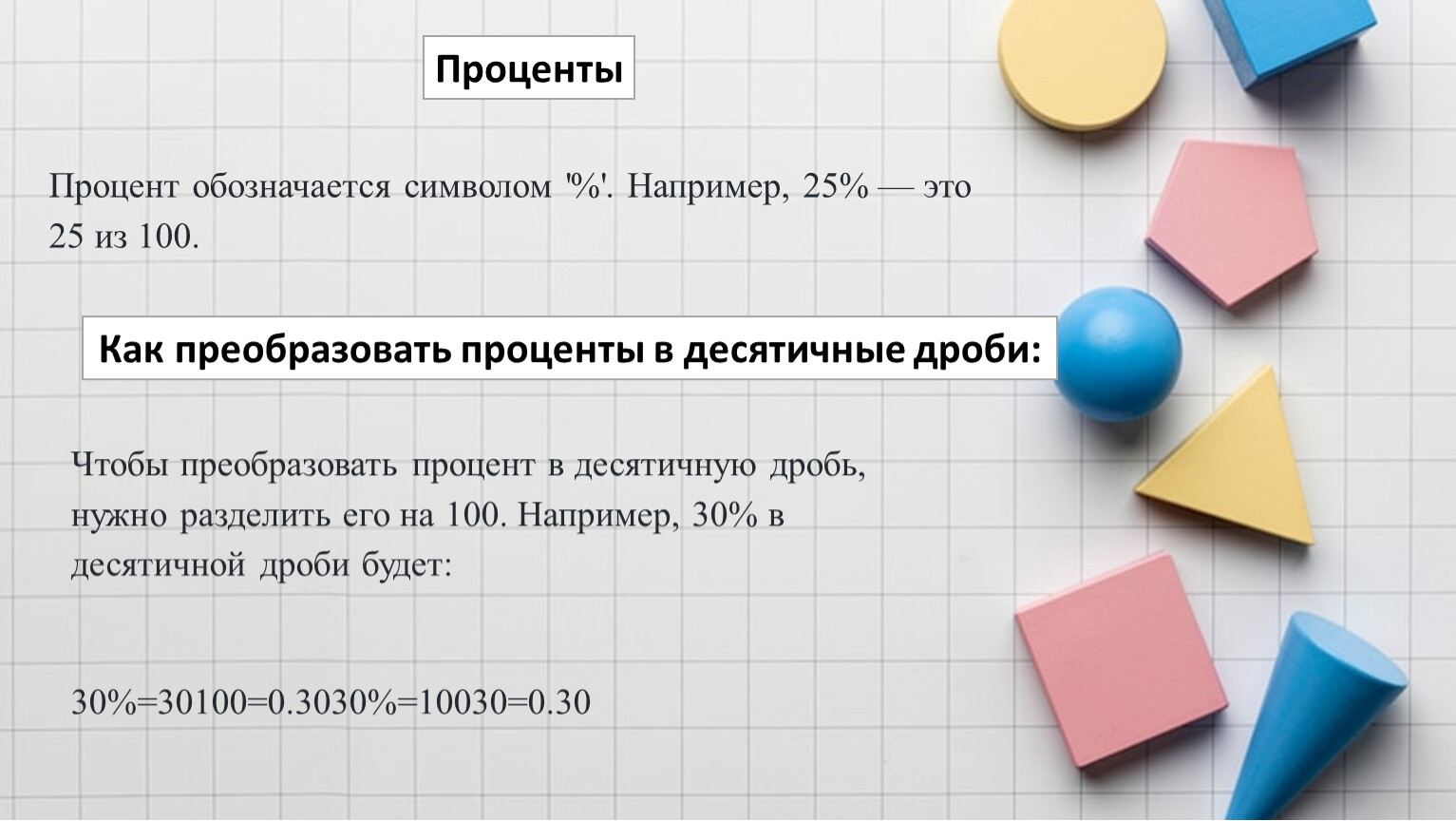 Чтобы преобразовать процент в десятичную дробь, нужно разделить его на 100. Например, 30% в десятичной дроби будет: