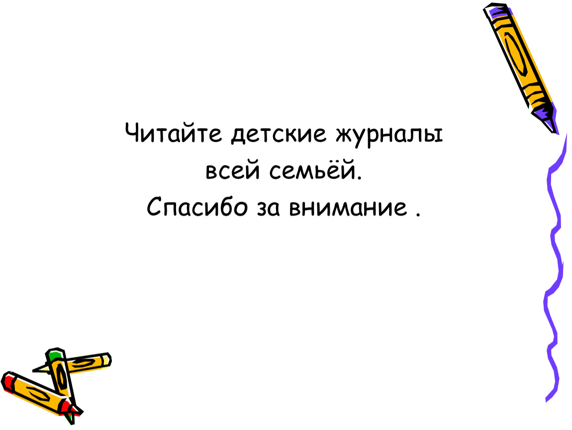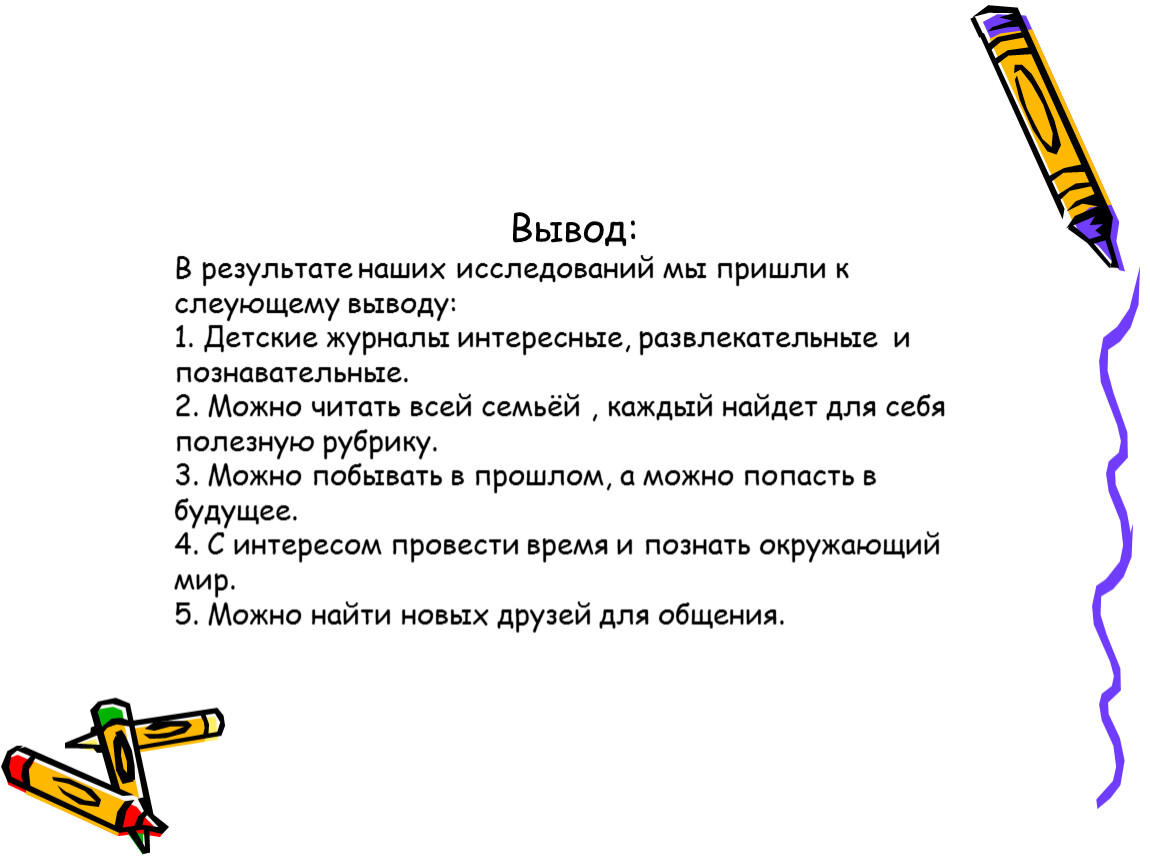 Вывод:В результате наших исследований мы пришли к слеующему выводу:1. Детские журналы интересные, развлекательные и познавательные.2. Можно читать всей семьёй , каждый найдет для себя полезную рубрику.3. Можно побывать в прошлом, а можно попасть в будущее.4. С интересом провести время и познать окружающий мир.5. Можно найти новых друзей для общения.