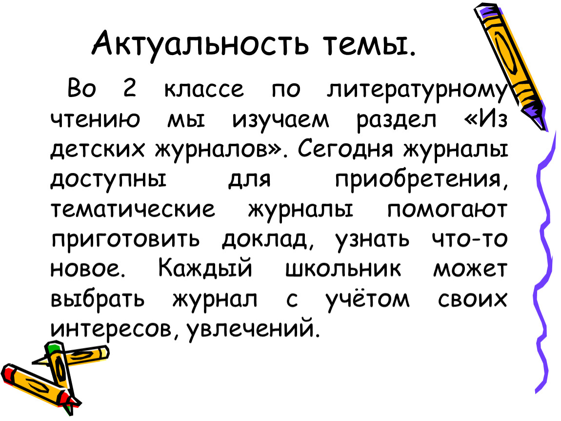 Во 2 классе по литературному чтению мы изучаем раздел «Из детских журналов». Сегодня журналы доступны для приобретения, тематические журналы помогают приготовить доклад, узнать что-то новое. Каждый школьник может выбрать журнал с учётом своих интересов, увлечений.