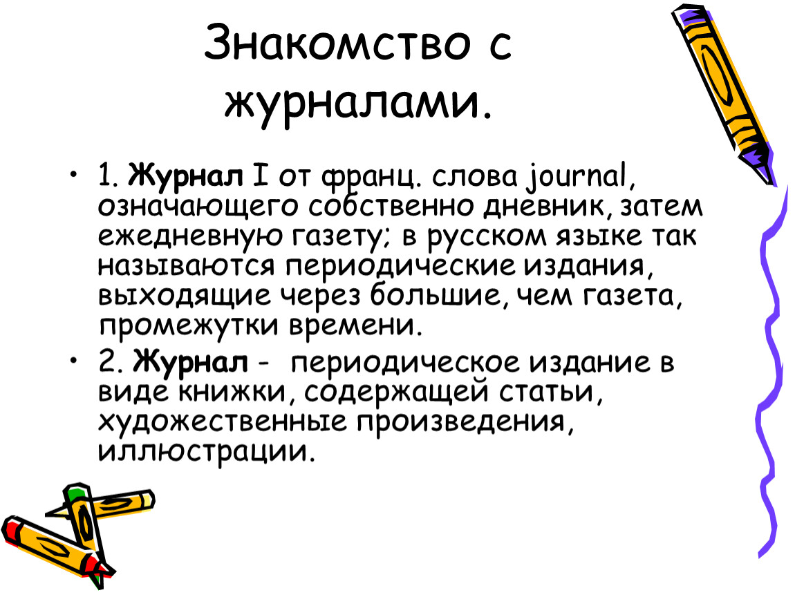 2. Журнал - периодическое издание в виде книжки, содержащей статьи, художественные произведения, иллюстрации.