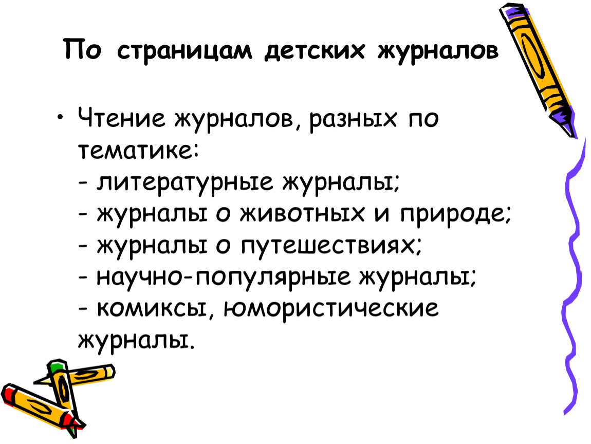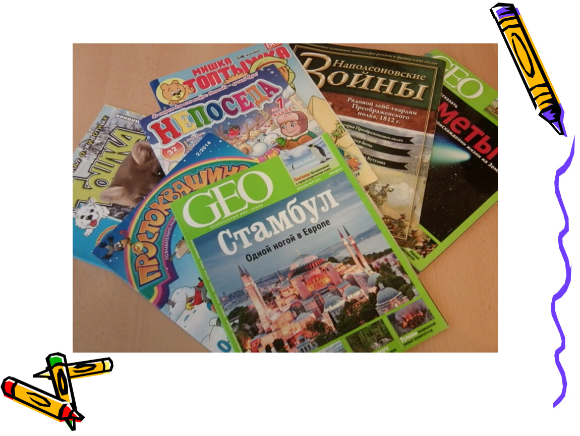 Чтение журналов, разных по тематике:- литературные журналы;- журналы о животных и природе;- журналы о путешествиях;- научно-популярные журналы;- комиксы, юмористические журналы.