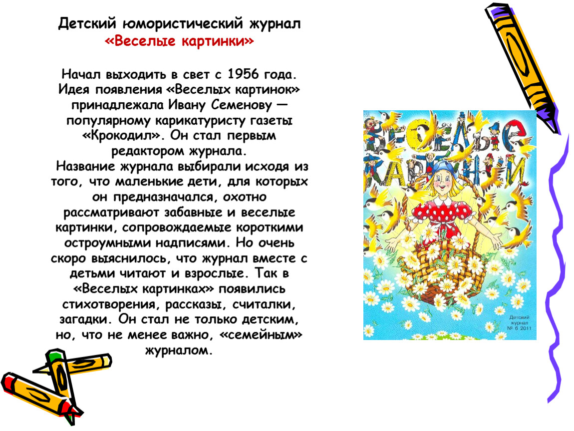 Детский юмористический журнал «Веселые картинки» Начал выходить в свет с 1956 года. Идея появления «Веселых картинок» принадлежала Ивану Семенову — популярному карикатуристу газеты «Крокодил». Он стал первым редактором журнала. Название журнала выбирали исходя из того, что маленькие дети, для которых он предназначался, охотно рассматривают забавные и веселые картинки, сопровождаемые короткими остроумными надписями. Но очень скоро выяснилось, что журнал вместе с детьми читают и взрослые. Так в «Веселых картинках» появились стихотворения, рассказы, считалки, загадки. Он стал не только детским, но, что не менее важно, «семейным» журналом.