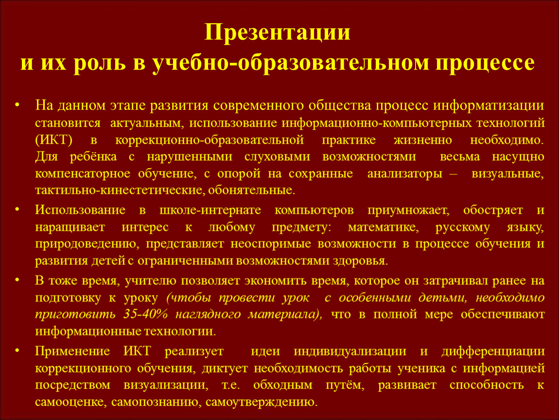 Применение ИКТ реализует идеи индивидуализации и дифференциации коррекционного обучения, диктует необходимость работы ученика с информацией посредством визуализации, т.е. обходным путём, развивает способность к самооценке, самопознанию, самоутверждению.